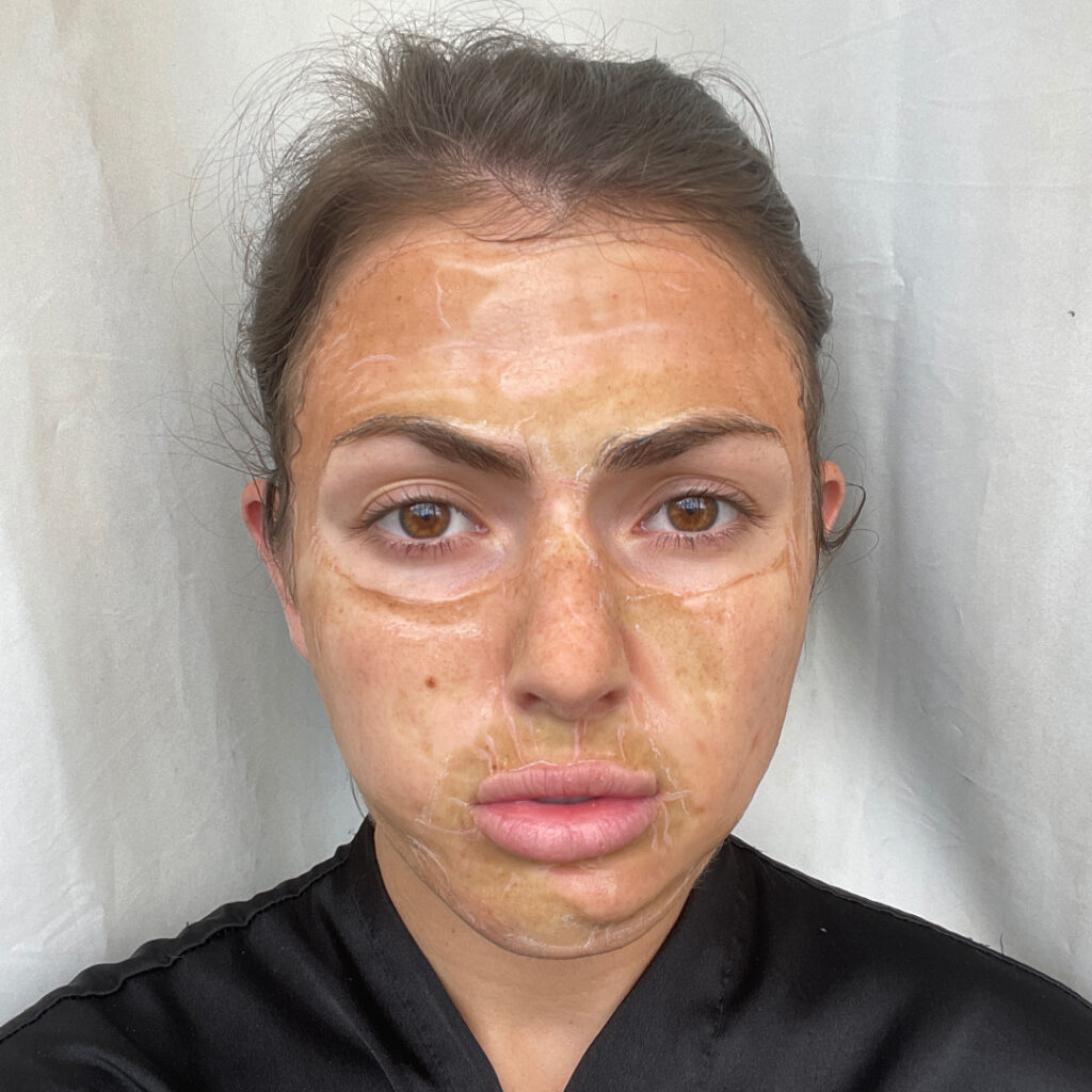 The set comes with four glass Octolift® Ampoules, 4 Octolift® Solutions, and an applicator brush with a glass handle. All you do is mix the ampoule with the solution, shake for 20 seconds, and apply it with the provided brush. What happens next is part of the reason Hanacure gets so much attention: you’ll look like an alien as the solution firms and dries in a process January Jones called “for real intense.”