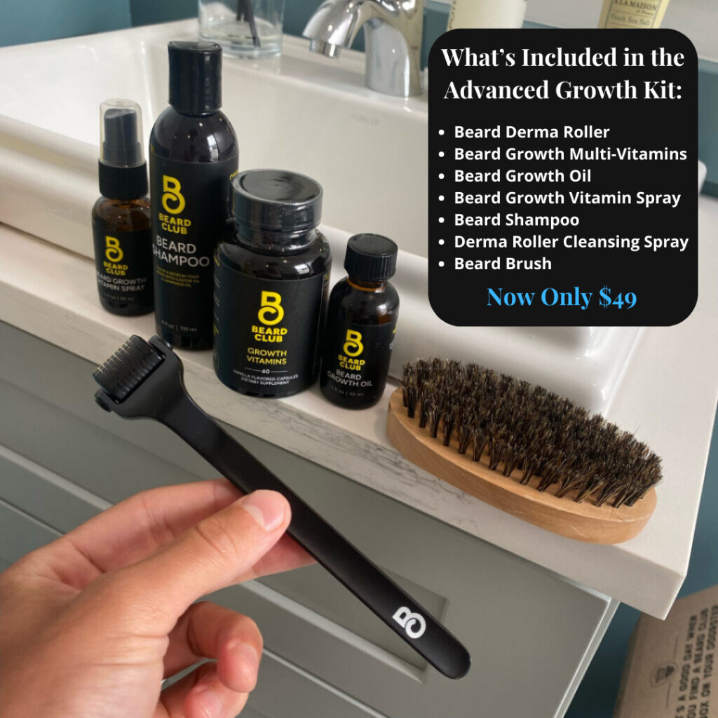 The kit also comes with a cleansing spray to keep the roller sanitary, a Growth Vitamin Spray loaded with nutrients for beard growth, some vitamins packed with minerals known to support hair growth, a growth oil made from things like castor and coconut oils, some beard shampoo that doesn’t strip away hydration, and a boar bristle brush